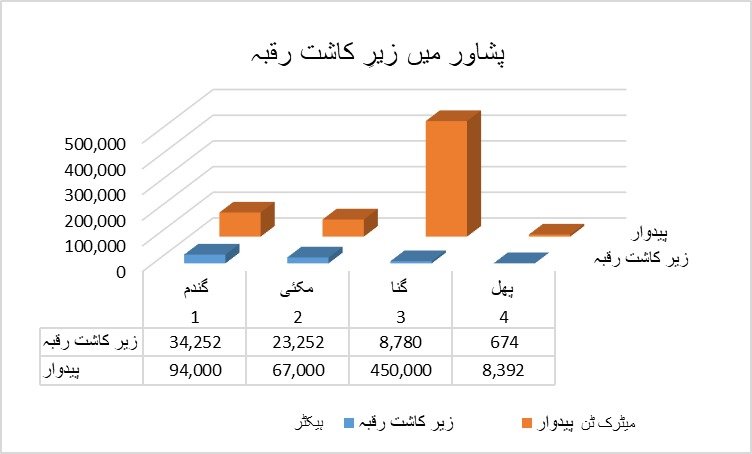 اعداد و شمار کے مطابق 34 ہزار 252 ہیکٹر پر گندم کی کاشت سے تقریباً 94 ہزار میٹرک ٹن، 8 ہزار 780 ہیکٹر پر گنے کی کاشت سے ساڑھے چار لاکھ میٹرک ٹن، جبکہ 23 ہزار 252 ہیکٹر پر مکئی سے 67 ہزار میٹرک ٹن پیداوار حاصل کی گئی۔ اس کے علاوہ 674 ہیکٹر زمین پر خوبانی، آڑو اور آلو بخارا سے 8 ہزار 382 میٹرک ٹن پیداوار حاصل ہوئی۔ سال 2021-22 میں پشاور میں 78 ہزار 854 ہیکٹر زمین زیرِ کاشت تھی۔